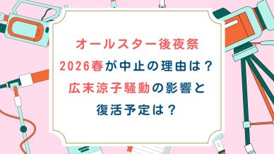 Uncategorized オールスター後夜祭2026春が中止の理由は?広末涼子騒動の影響と復活予定は? TBS春の風物詩『オールスター感謝祭'26春』の放送が2026年4月4日(土)に決定しましたが、深夜の延長戦である『オールスター後夜祭』の放送予定が番組表に見当たらない事態となっています。多くの視聴者... 2026.03.06 Uncategorized